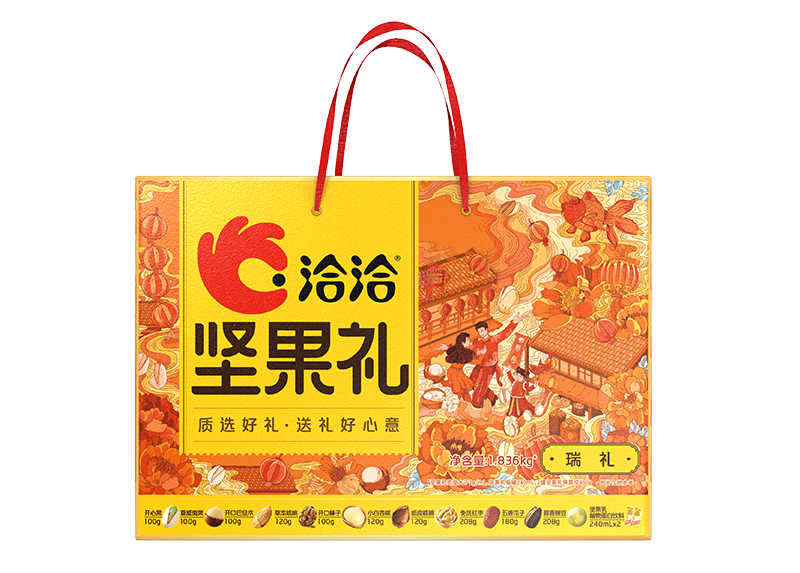 内容物:开心果100g、夏威夷果100g、开口巴旦木100g、纸皮核桃120g、草本核桃120g、开口榛子100g、小白杏核120g、免洗红枣208g、香瓜子180g、蒜香豌豆208g、坚果乳植物蛋白饮料240mL*2